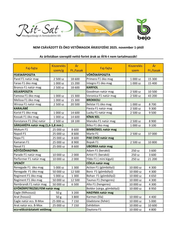 Bejo nem csávázott és öko vetőmagok árjegyzéke 2025.11.01-től